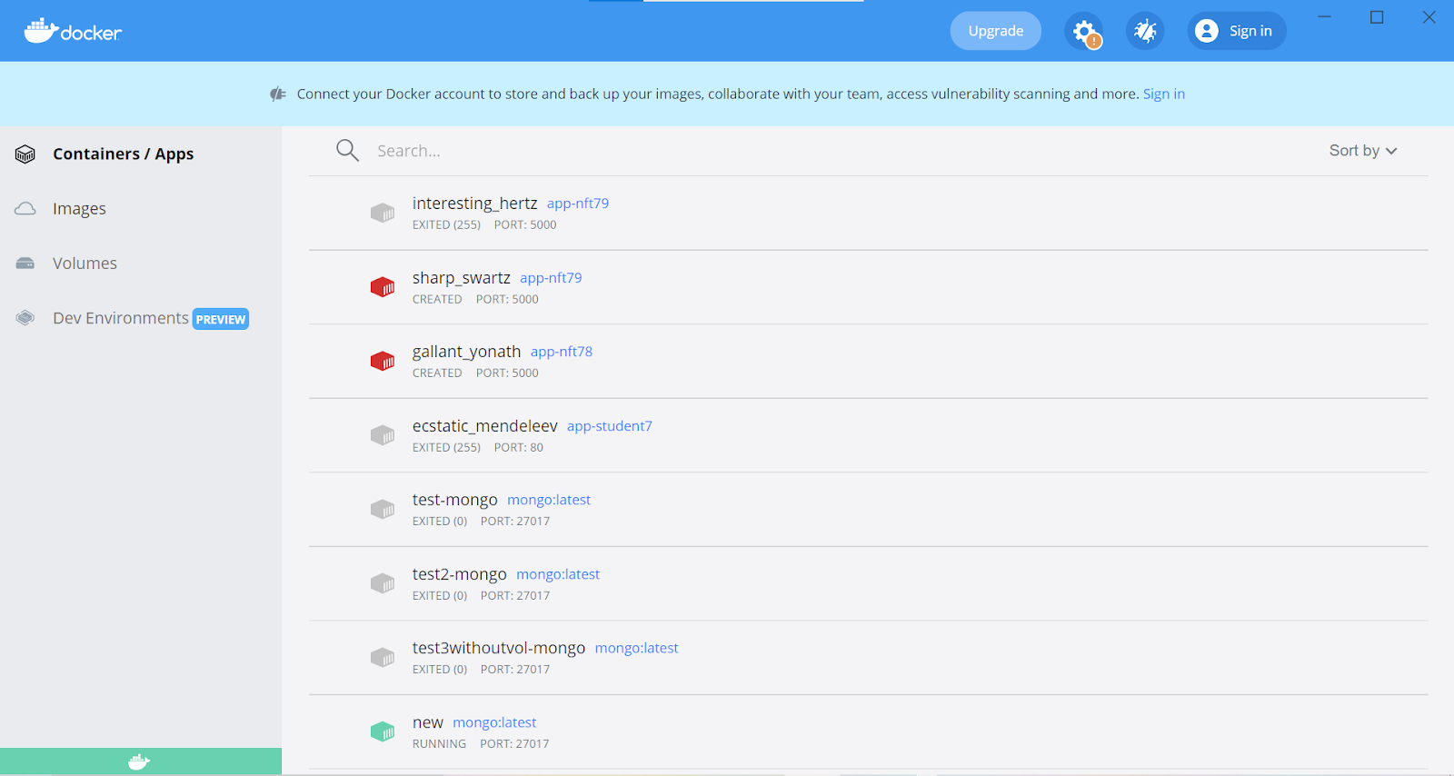 For this container, you did not attach a volume. So when you create a new container from the same MongoDB image, it will start with an empty database. Go to Docker Desktop and stop the running container test-mongo. You can also use docker stop test-mongo to stop the container from the terminal. To see the list of running containers and their details, use docker container list. Then create another container for MongoDB from the terminal: