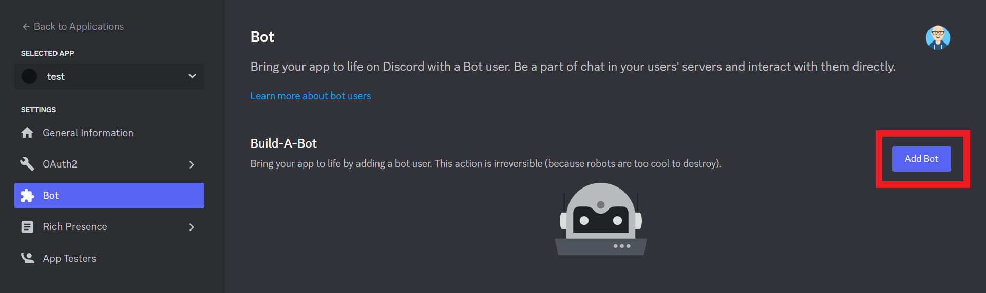 Click on Bot on the left-hand menu panel and then click on the Add Bot button.