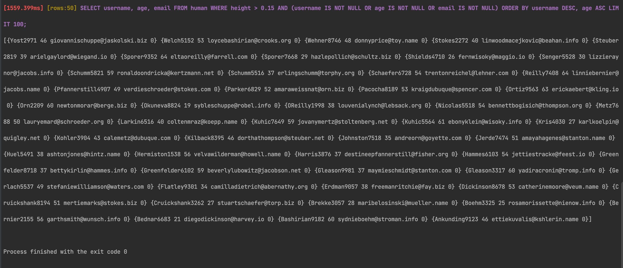 }The complex function runs a SQL query that selects the username, age, and email of humans taller than 0.15 meters and have a non-null username, age, or email, ordered by username descending and age ascending, limited to 100 rows.