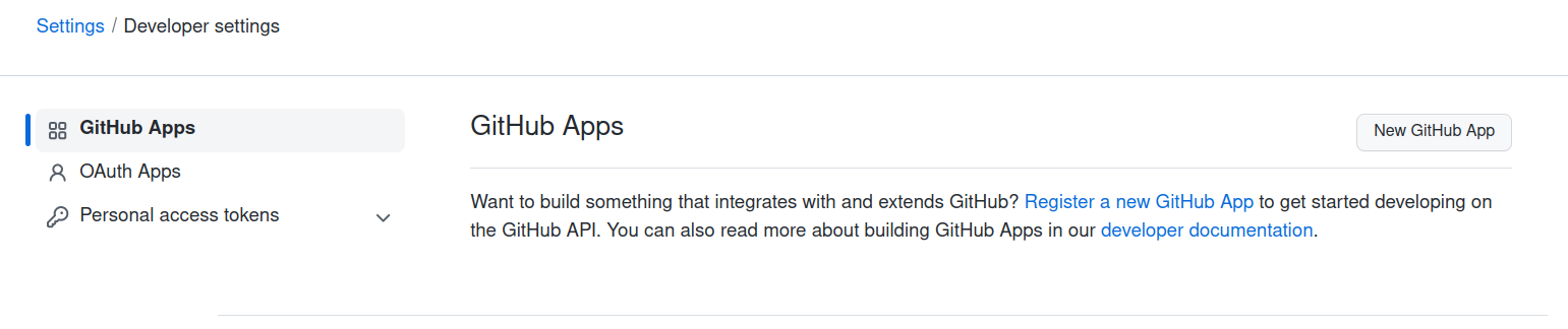 From GitHub Settings Page, and click on Developer Settings option on the sidebar. You should see a similar screen to the one below: