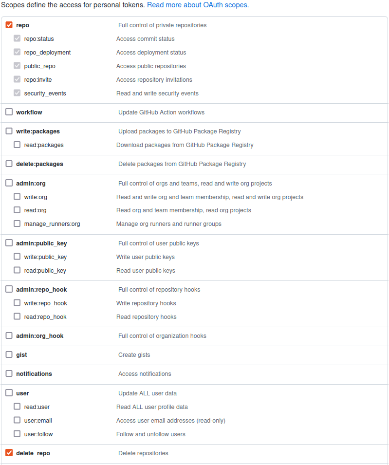 Check the repo and delete_repo boxes so you can create, update, and delete a repository.