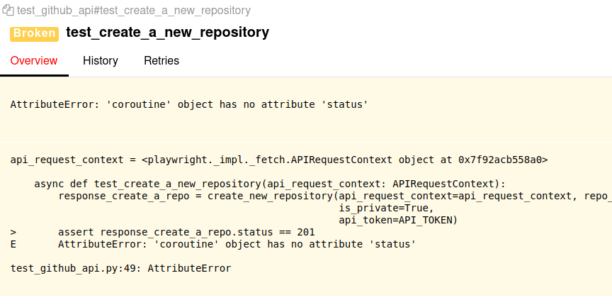 pytest complains that the coroutine object response_create_a_repo does not have a status attribute. Usually, the response of the API should always have a status attribute, regardless of the status of the API test.