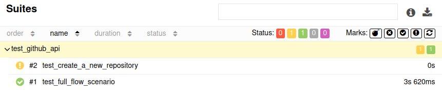 From the allure report, we can see one broken test. Clicking on the “Suites” menu on the left panel, we see the test that has failed is test_create_a_new_repository.
