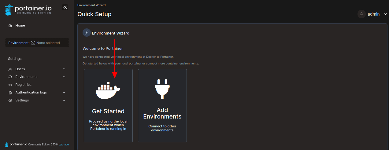 You’ll be taken to the environment setup wizard. This is where you connect Portainer to your containerization systems. Click the Get Started button to continue with the local Docker socket mounted into the container from your host, and you’ll end up on the Portainer dashboard: