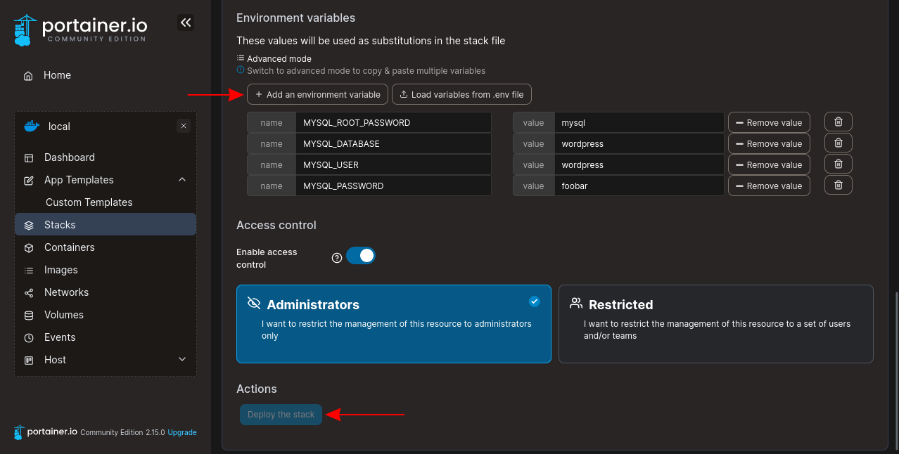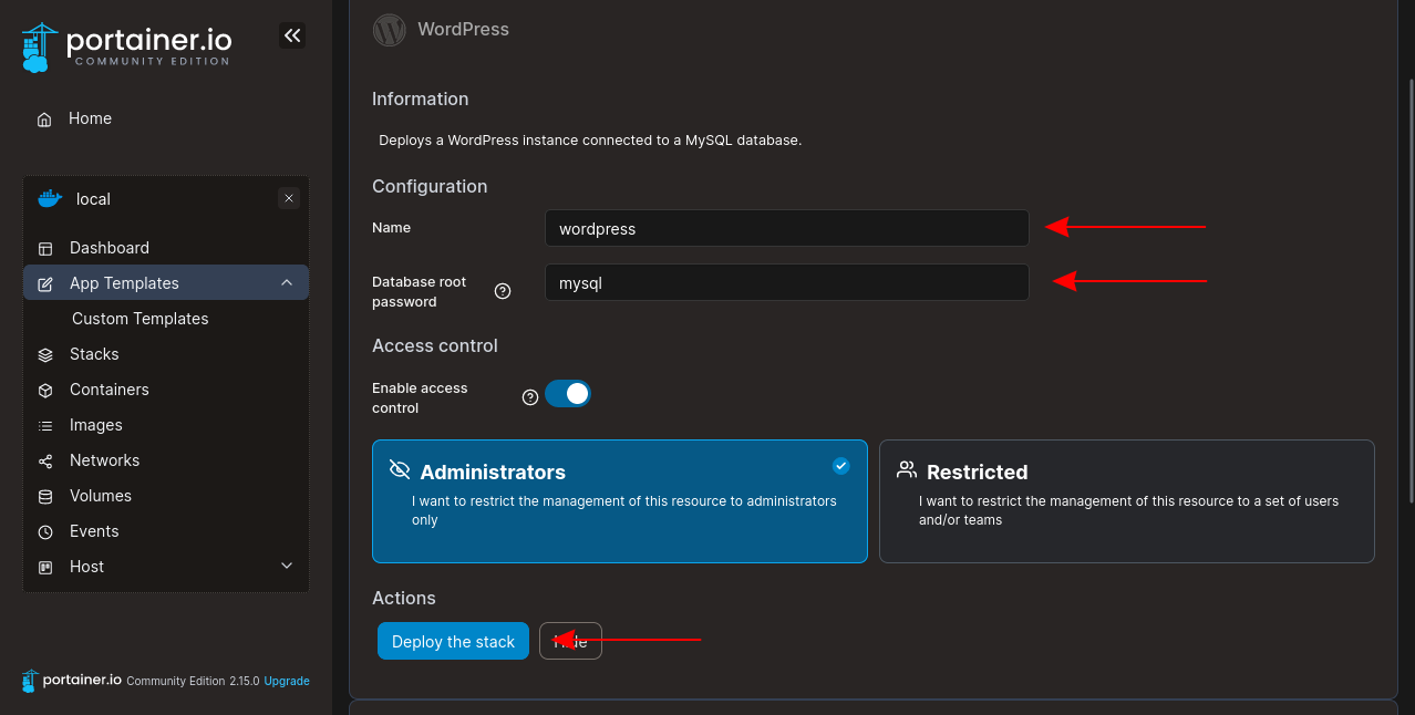 The template comes preconfigured with the services you need to run a WordPress site. You only have to supply a name for your stack and the root password to set it on the MySQL database server. Enter these into the fields at the top of the page, and then press the Deploy the stack button at the bottom: