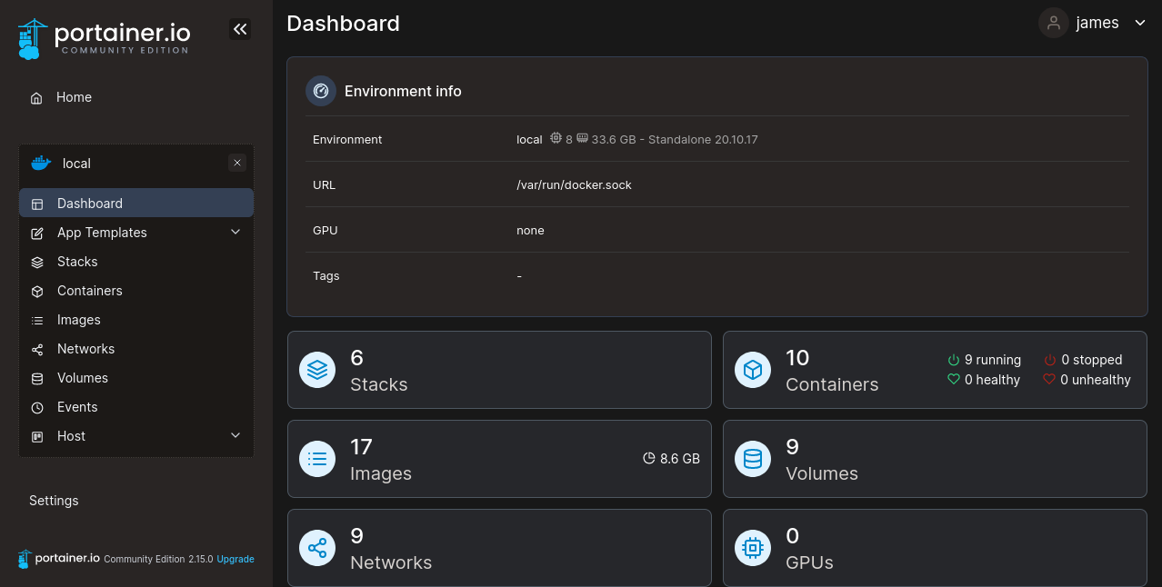 Each environment gets a summary tile, giving quick insights into the number of running, stopped, and healthy containers, as well as counts of the images and volumes available. The sidebar to the left of the screen is where you can navigate between environments, resource types, and application-level global settings:
