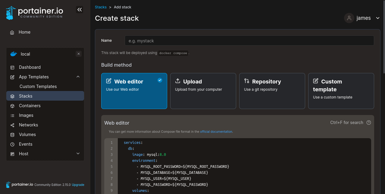 - Web editor: This lets you type out a Docker Compose file manually.
