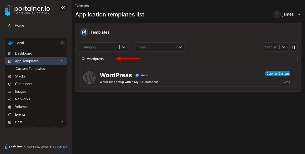 Templates are an even easier way to launch new application instances. Portainer comes with a set of built-in templates for popular apps. These can be reached by heading to App Templates on the left sidebar. You can also create your own templates based on Compose files: