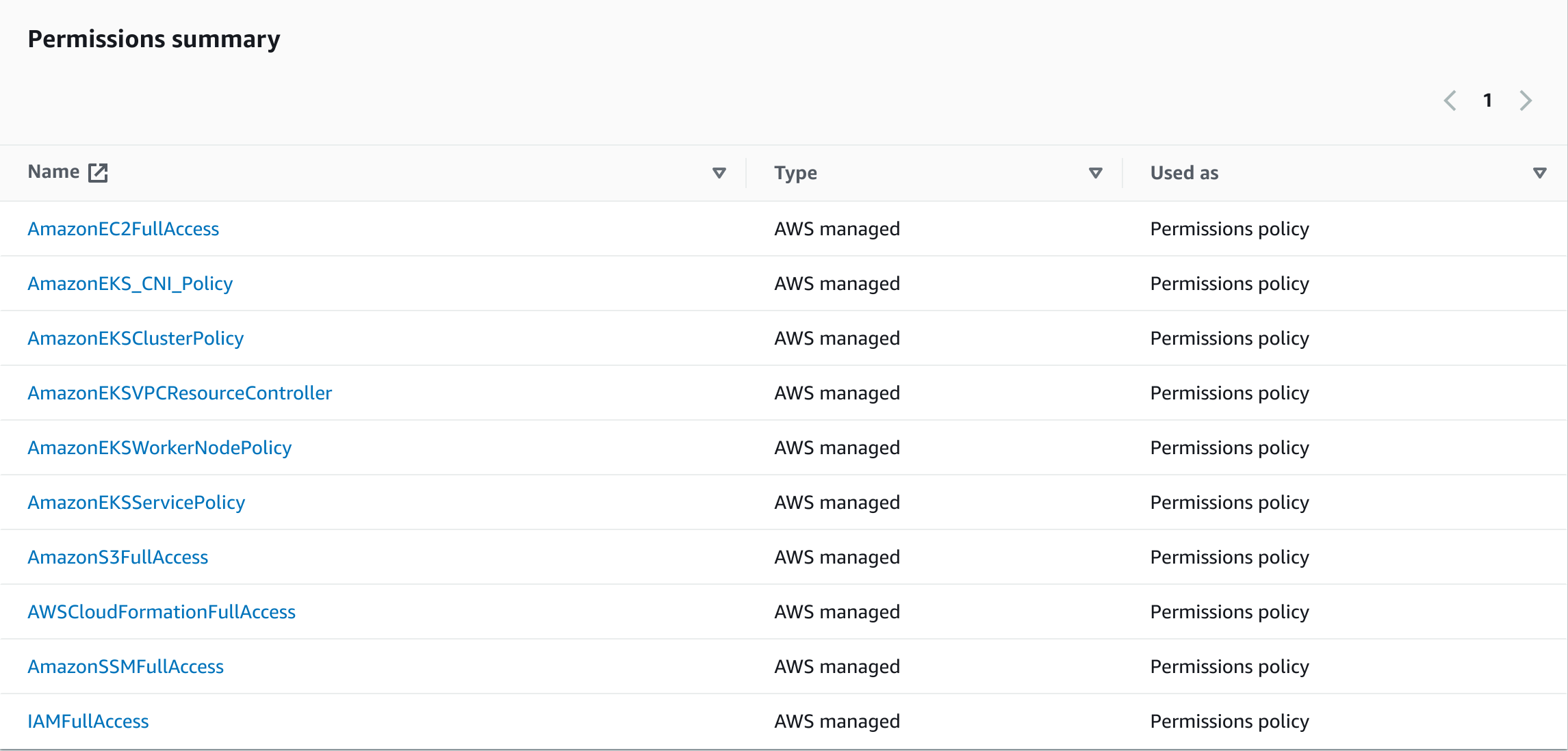 AmazonEC2FullAccess: This allows full access to all actions on the Amazon EC2 service, which includes instance management, security group operations, and more.AmazonEKS_CNI_Policy: This policy applies to the Amazon EKS node(s) IAM role. It allows the Amazon VPC CNI plugin to make calls to AWS APIs on your behalf.AmazonEKSClusterPolicy: This allows the entity (user, group, or role) to create or delete Amazon EKS Clusters.AmazonEKSServicePolicy: This provides the permissions necessary to run the Amazon EKS service. It includes permissions for launching and managing the Amazon EKS control plane.AmazonEKSVPCResourceController: This allows the entity to manage VPC Elastic Network Interfaces (ENI), necessary for the Amazon EKS VPC Resource Controller to operate.AmazonEKSWorkerNodePolicy: This provides the necessary permissions for worker nodes to connect to the Amazon EKS cluster control planeAmazonS3FullAccess: Provides full access to all actions on the Amazon S3 service, which includes bucket and object operations.AmazonSSMFullAccess: This allows full access to all AWS Systems Manager service actions.AWSCloudFormationFullAccess: This provides full access to AWS CloudFormation. This includes permissions to create, update, and delete CloudFormation stacks.IAMFullAccess: This allows full access to all actions on the IAM service, such as creating and managing users, roles, policies, and groups.