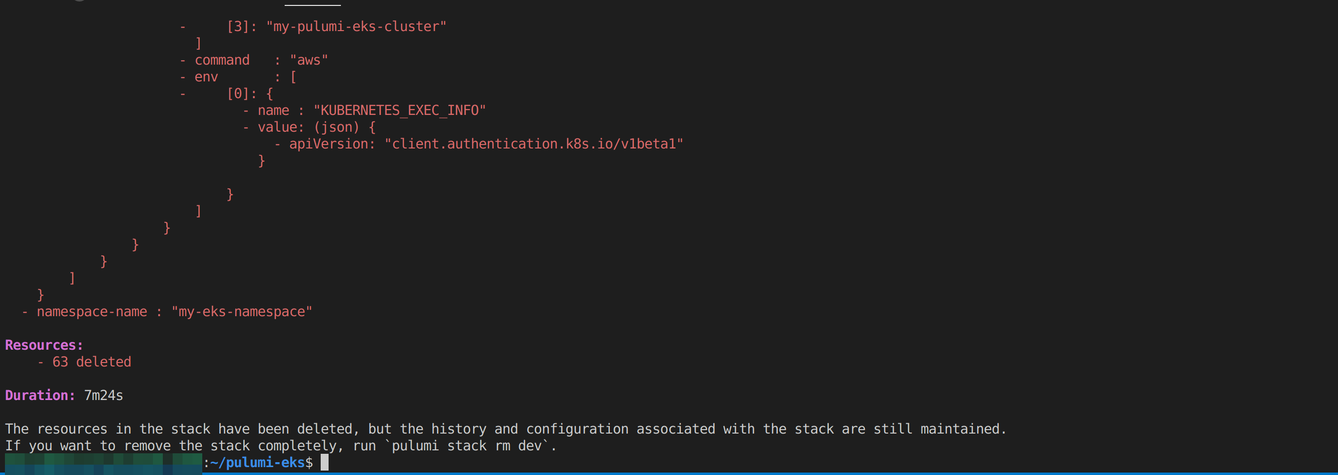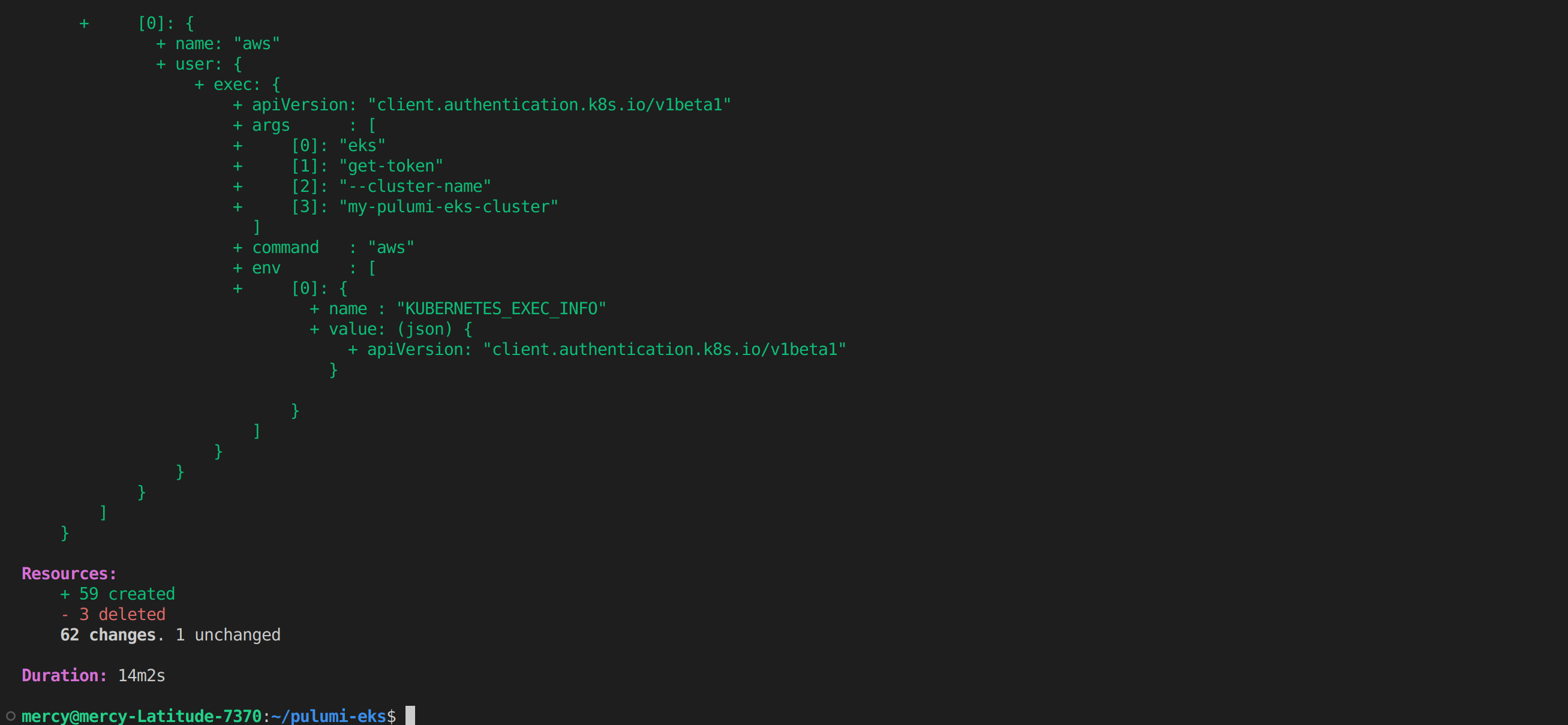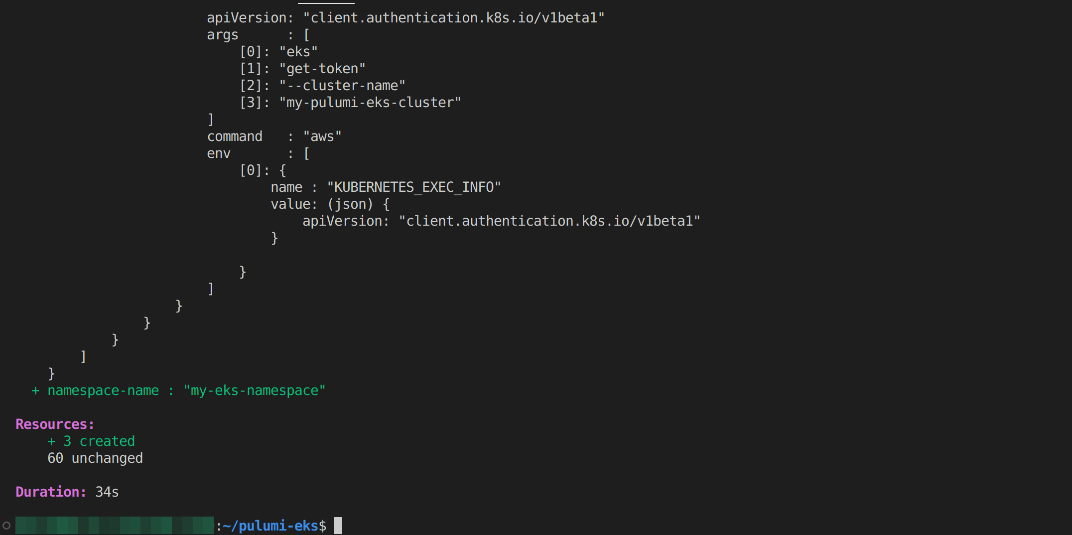 my-pulumi-eks-clusterusing theeks.NewClustermethod from theekspackage. - Then, it exports the EKS cluster kubeconfig as an output of the Pulumi program using the