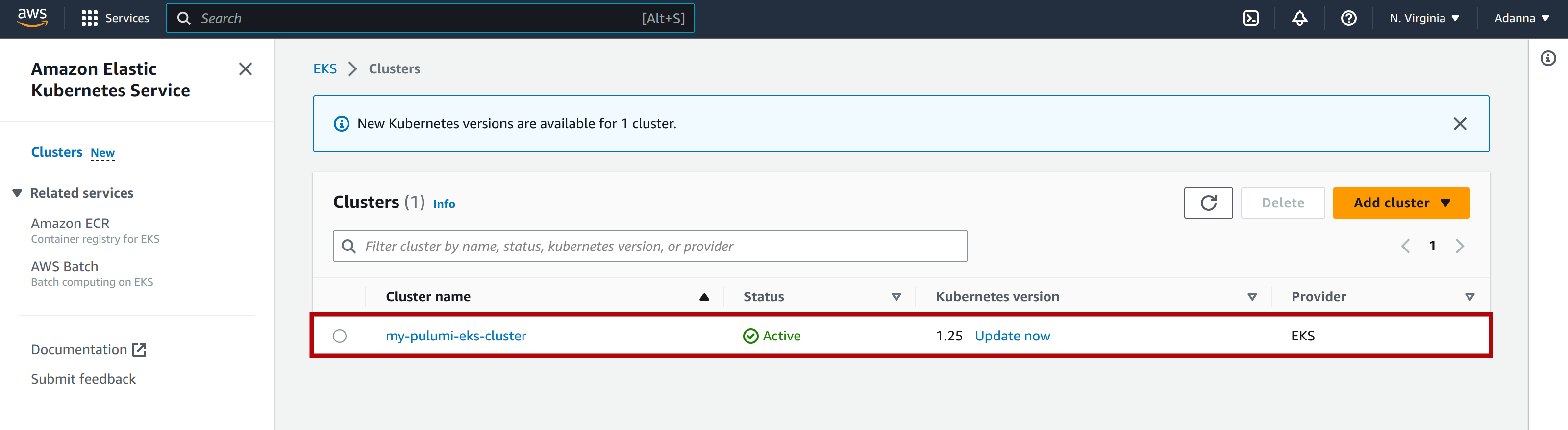 To find the EKS cluster that you created with Pulumi, go to your AWS Management Console and navigate to the Amazon EKS page. Make sure that you are in the correct region where you created the EKS cluster (us-east-1), and you should see your cluster as shown below: