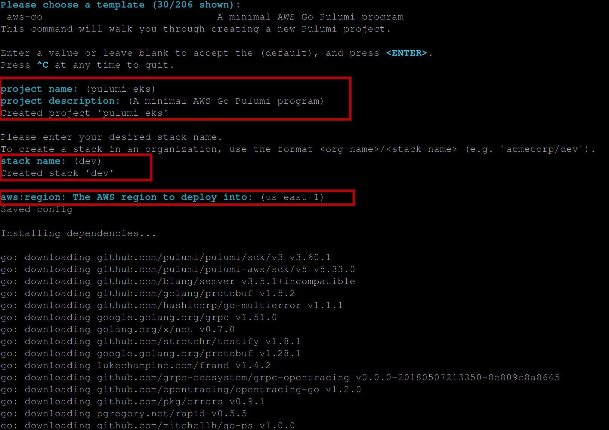 In the next step, you’ll be prompted to choose a template, a project name, a project description, a stack name, and an aws-region. Hit Enter all through to accept their defaults (this is optional, you can set them based on your preference if you like) and wait a little for pulumi to install all dependencies for your pulumi project; you should see output similar to this: