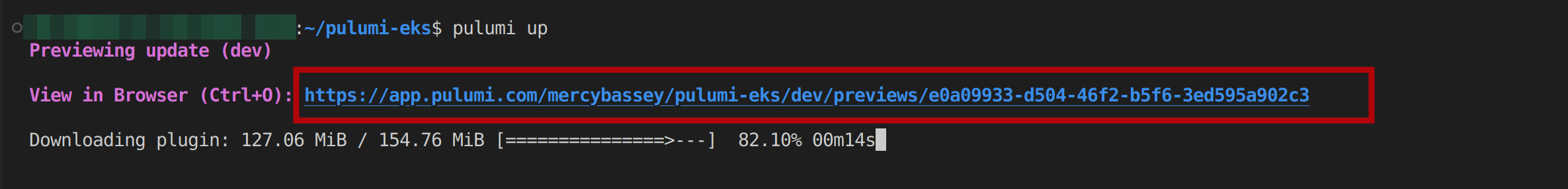 To execute this project, run the pulumi up command, which is used to execute a Pulumi project. This command will output a preview link containing the changes you are trying to make and then download the plugins for the cloud provider you are using to create resources in your infrastructure, which is AWS S3: