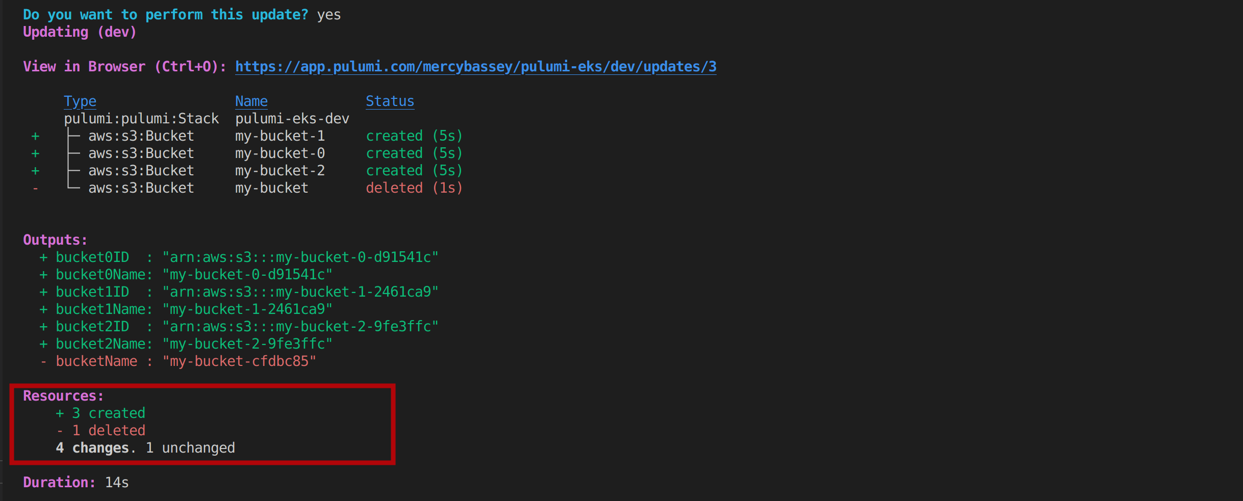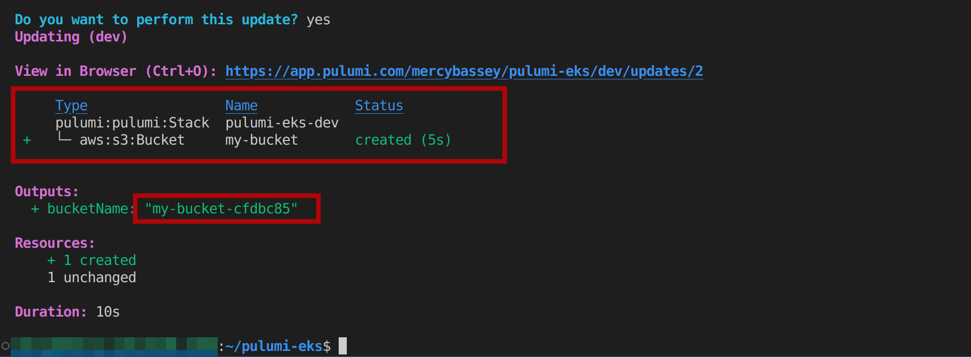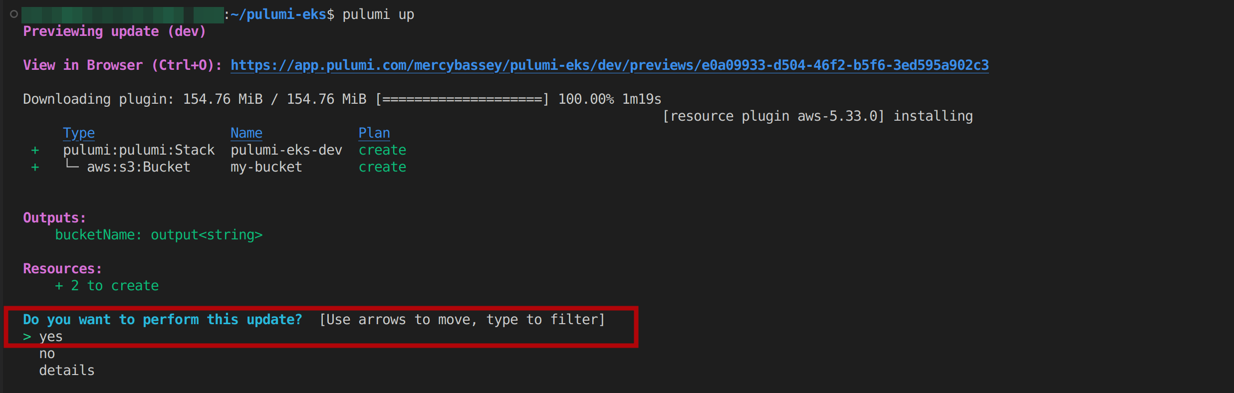 Heading back to your terminal, you’ll see that Pulumi asks you to verify if you’d like to make the update. Select the yes option, and hit Enter to continue: