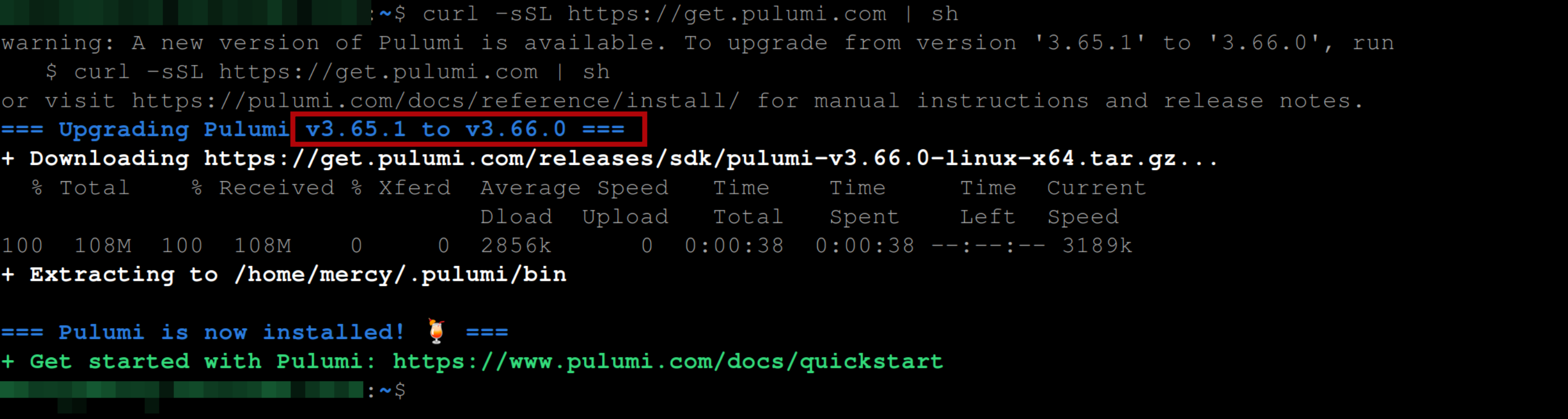 curl -fsSL https://get.pulumi.com | shAfter a successful installation, you should have something similar to the following output, which confirms that Pulumi was installed successfully: