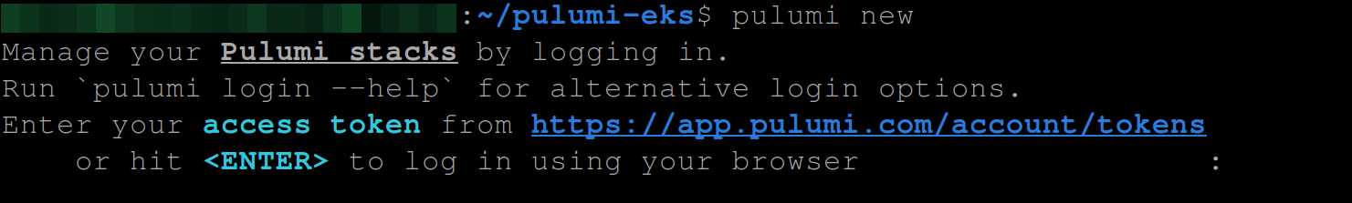 pulumi newThis command will ask you first to input a token; Go ahead and input the token and hit Enter to continue: