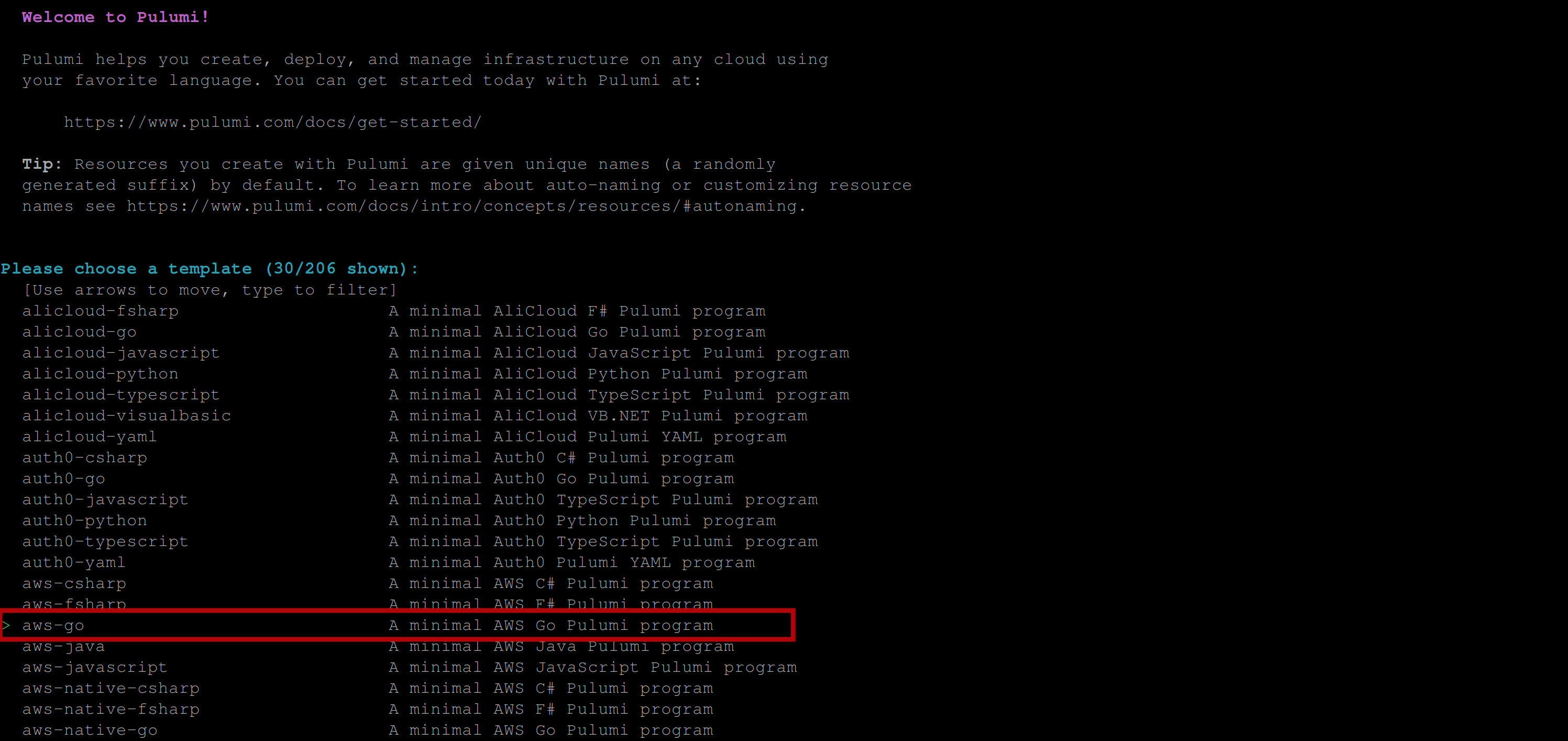 Once you have entered the token, you should have the following output that welcomes you to pulumi and asks you to select a platform and programming language. Select the aws-go option and press enter to proceed to the next step: