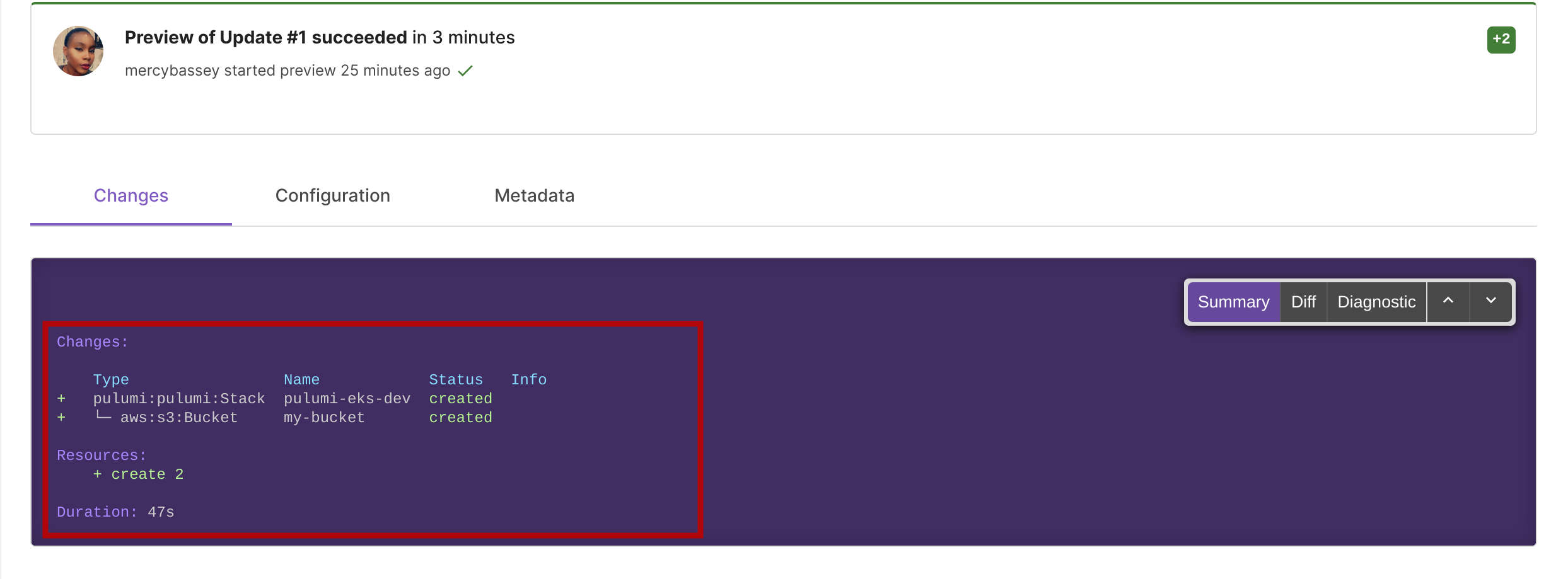Once you open up the preview link over a web browser, you’ll see a preview of the resources that will be created or updated in your cloud infrastructure based on the changes you have made to your Pulumi program.