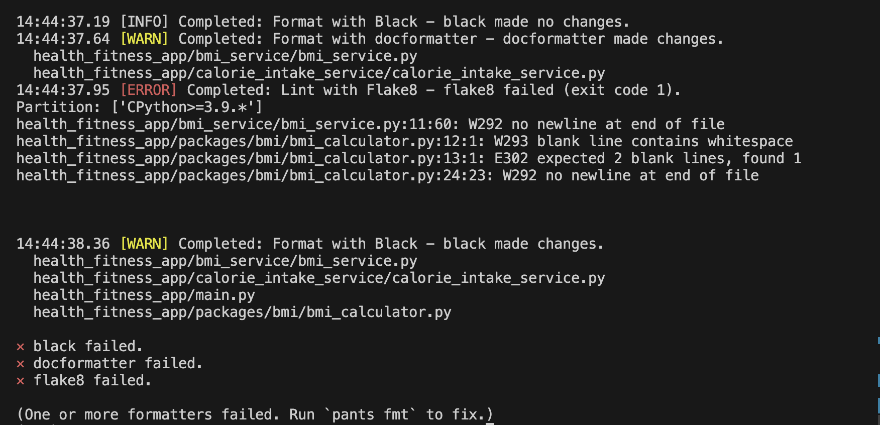 To fix the linting issues, run pants lint :: again: