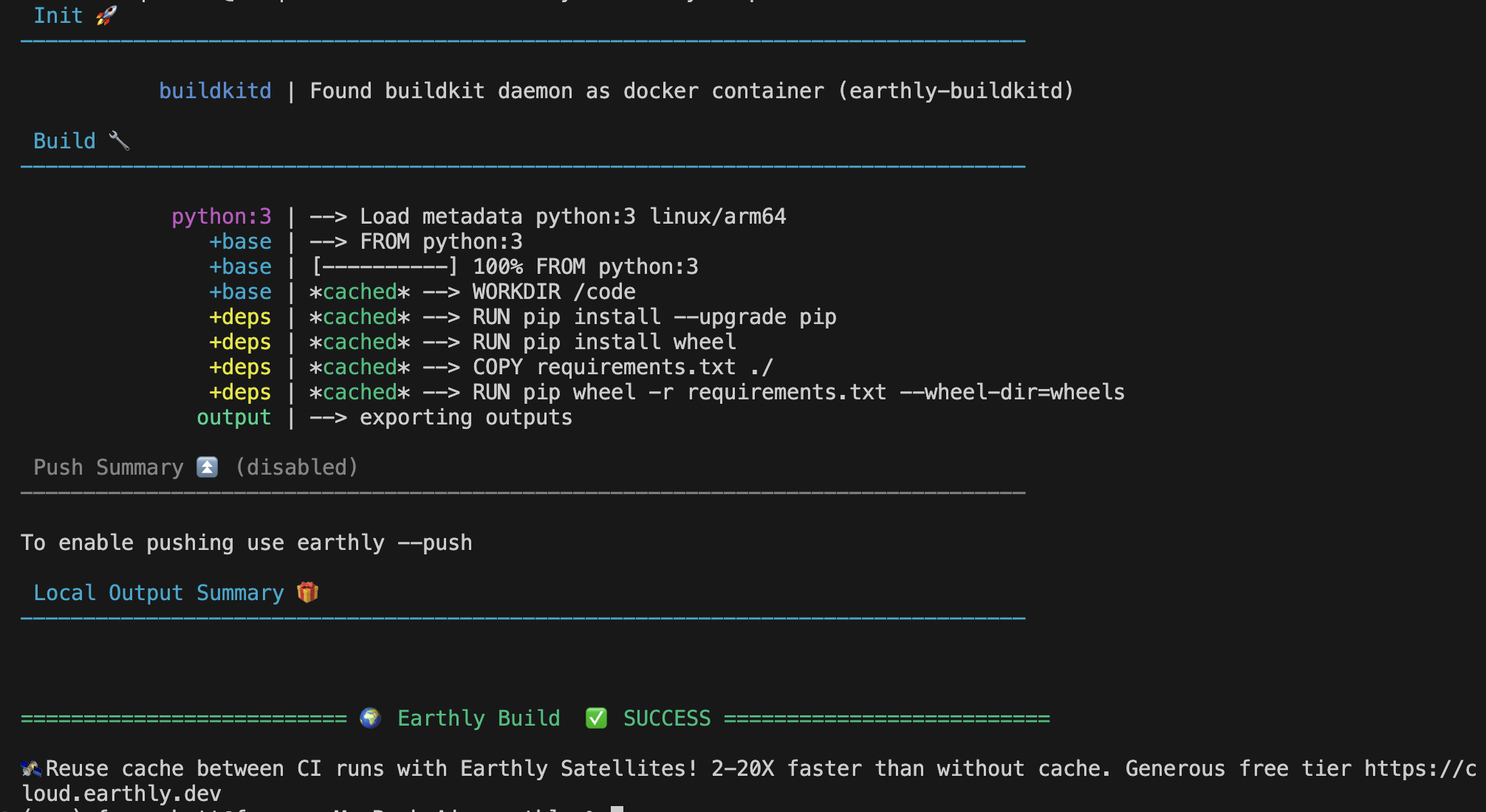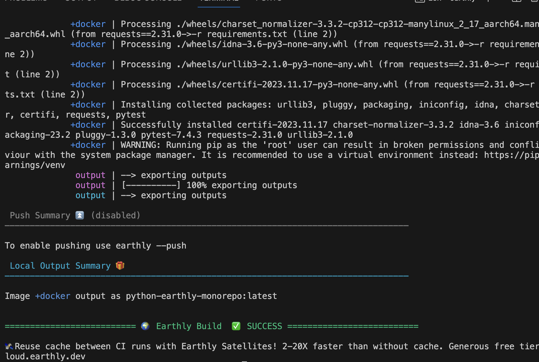 SAVE IMAGE python-earthly-monorepo:$tagThis Earthfile contains four different sections, or targets: deps, build, unit-tests, and docker. Each of these targets can be executed independently via the command earthly +<target>.