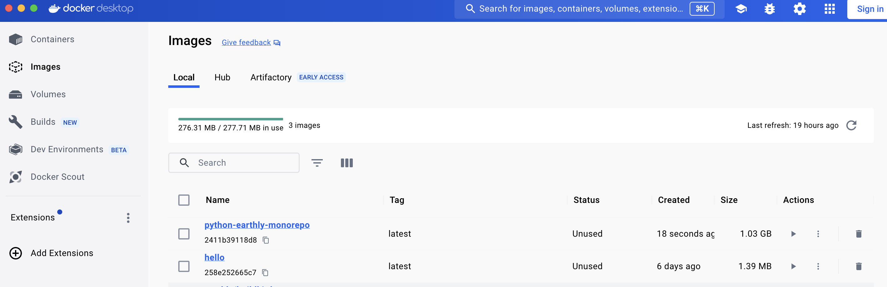If you navigate to Docker Desktop, you can see that Earthly successfully created a Docker image for the project: