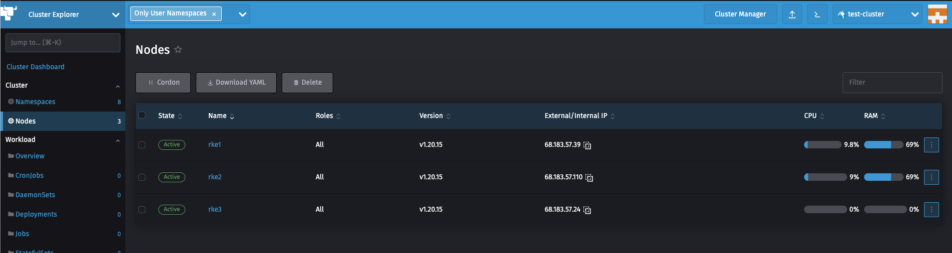This screen offers detailed information about the status of the selected cluster and is ideal for more detailed monitoring of the resources used. On the left, you can see a side menu with multiple options. Take a look at the nodes: