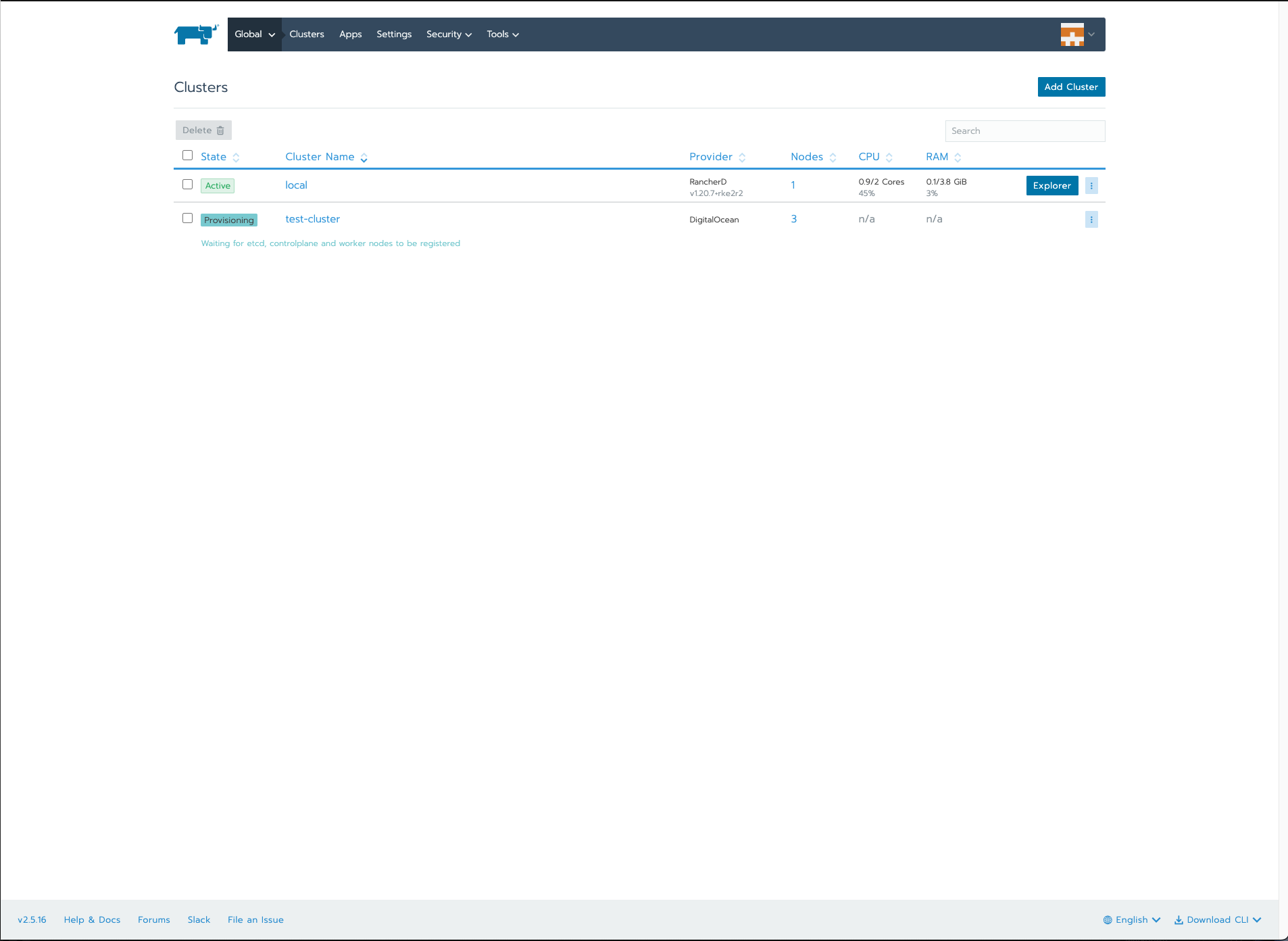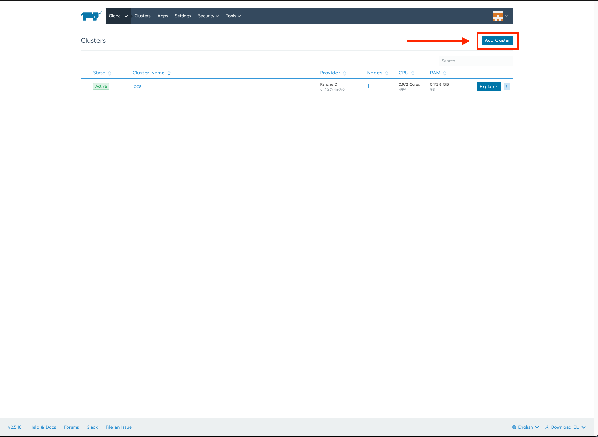 The following screen shows Rancher’s main dashboard. Note that only the cluster from which Rancher is running is displayed. To add more clusters, click the Add Cluster button located on the top right: