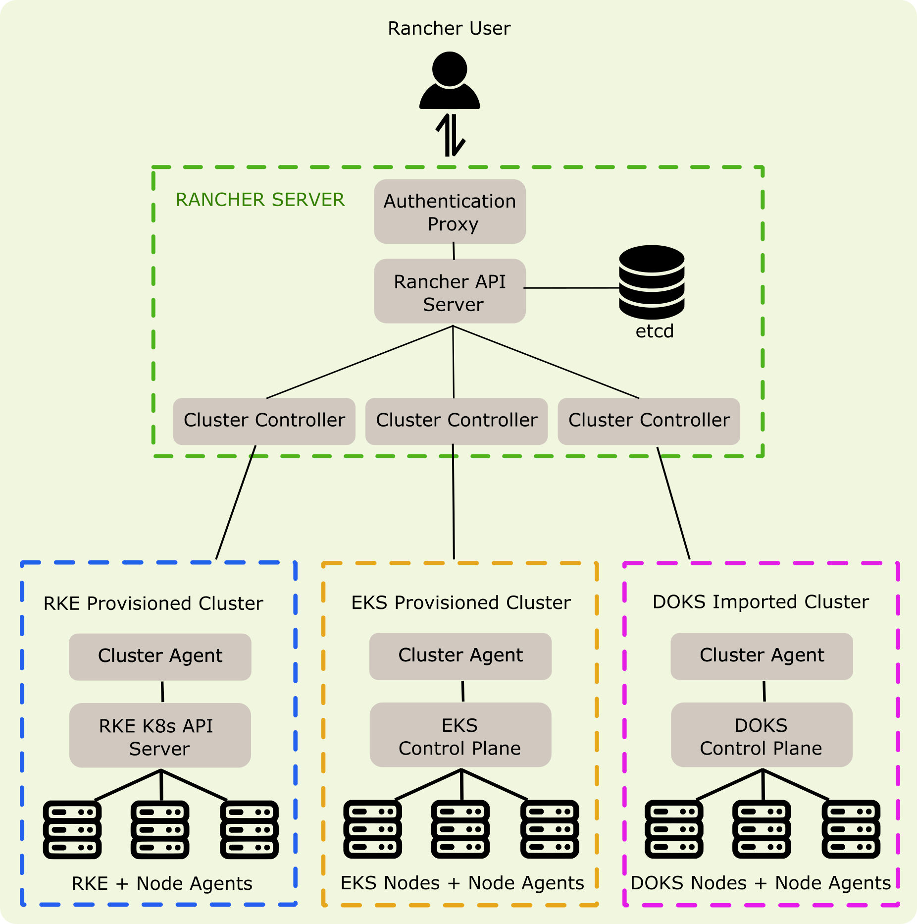 In a nutshell, Rancher simplifies managing, monitoring, importing, and provisioning Kubernetes clusters with just a few clicks from its intuitive UI. But how does Rancher achieve this? The following diagram gives you a high-level overview of the components that make it all possible:
