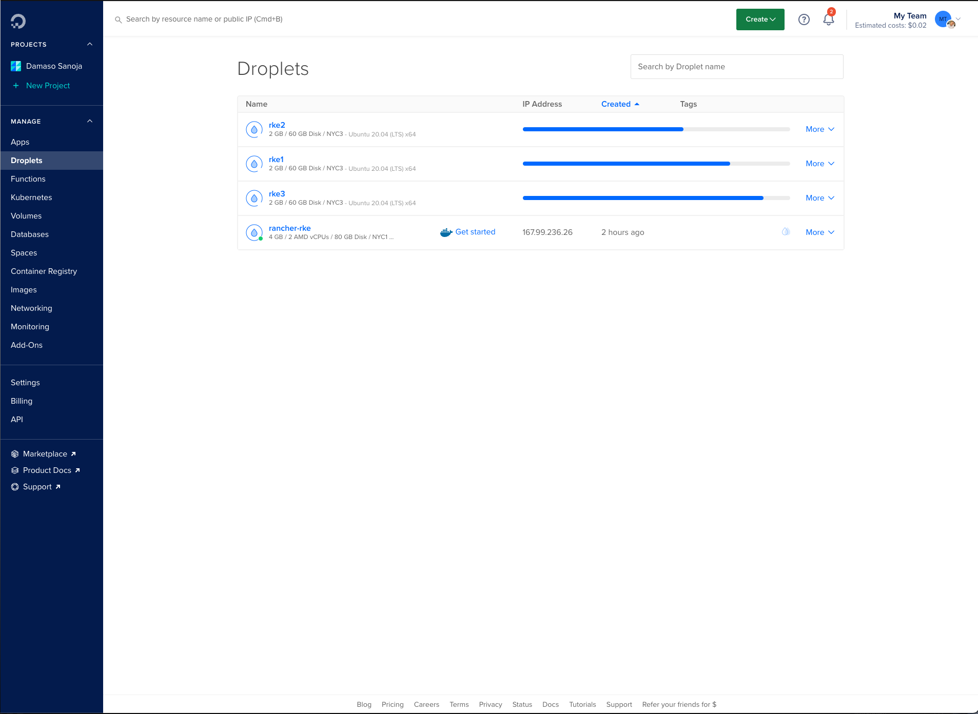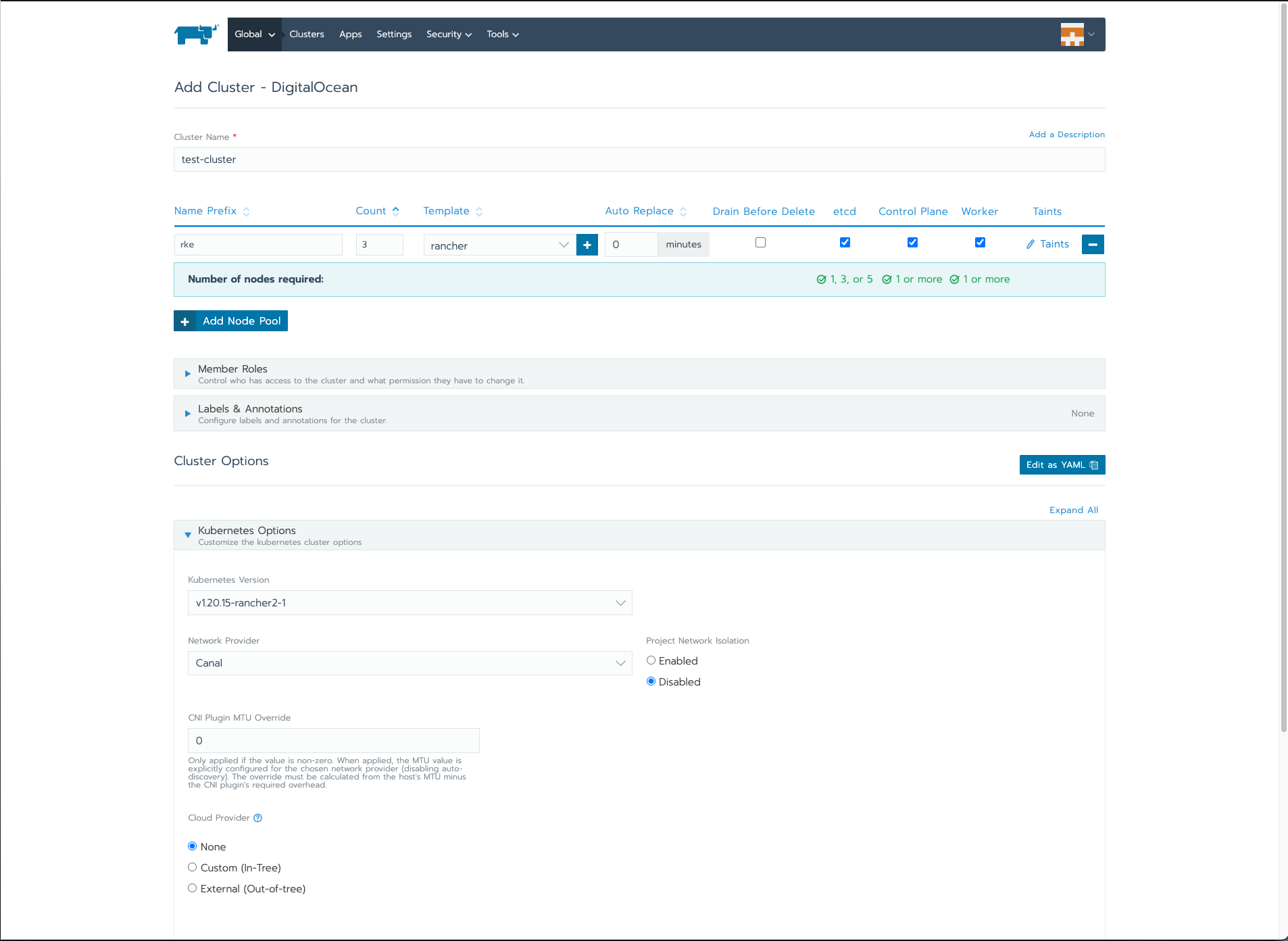 If you’re familiar with DigitalOcean, you may be interested in knowing which OS was used for each node and the specifications of the RAM, vCPU, and storage (the specific Droplet). An advantage of Rancher is that you can create and manage node templates for any supported host provider and then use those templates during cluster creation. Take a look at this example:
