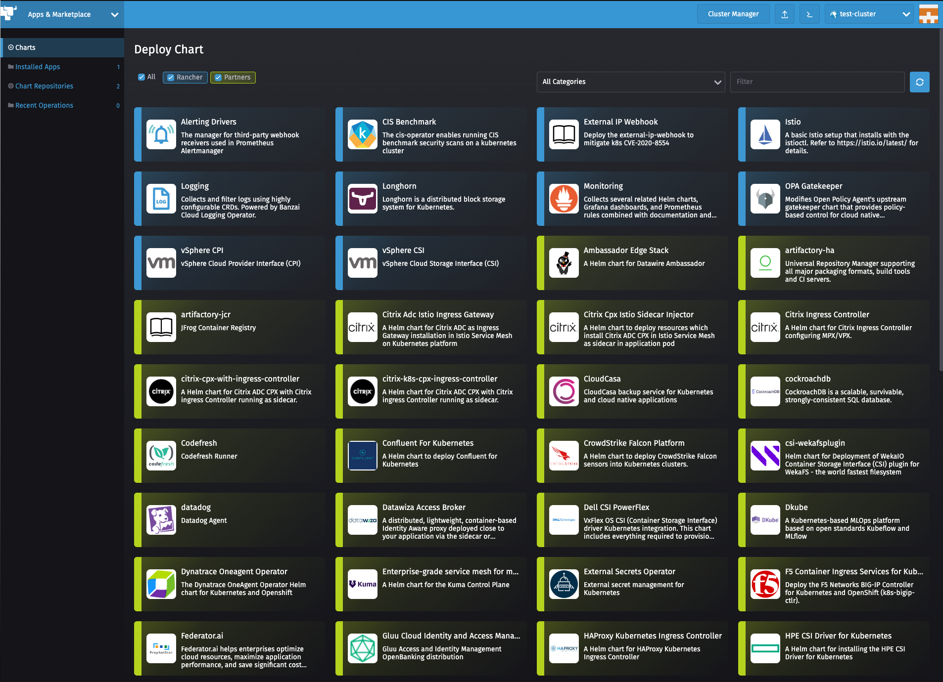 Since Rancher uses Helm, you can install any number of applications and tools on each cluster, and you can do it from the convenience of the Rancher marketplace: