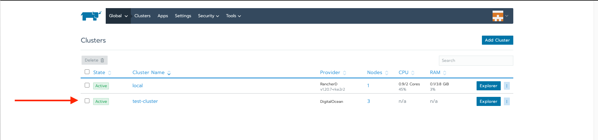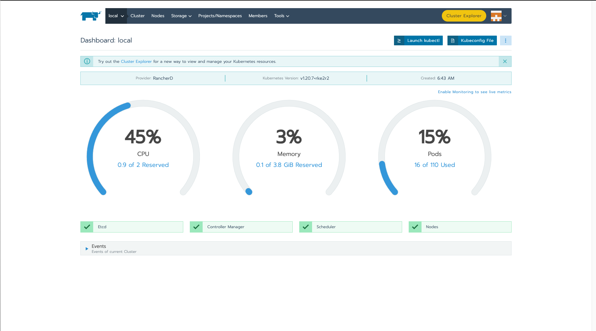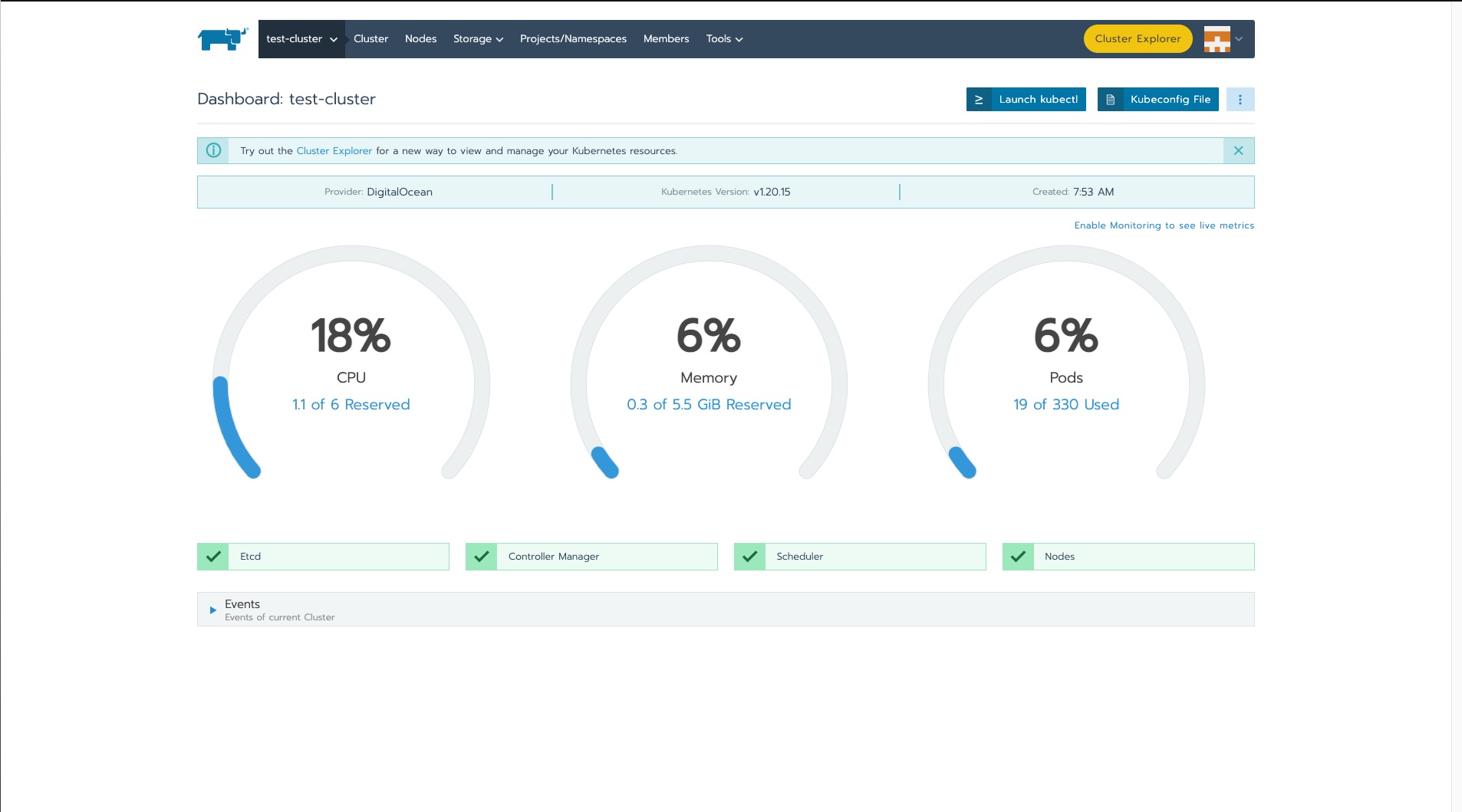Rancher’s convenience for managing multi-cluster environments doesn’t end there. Instead of clicking the Launch kubectl button, you could click the yellow button labeled Cluster Explorer located at the top left: