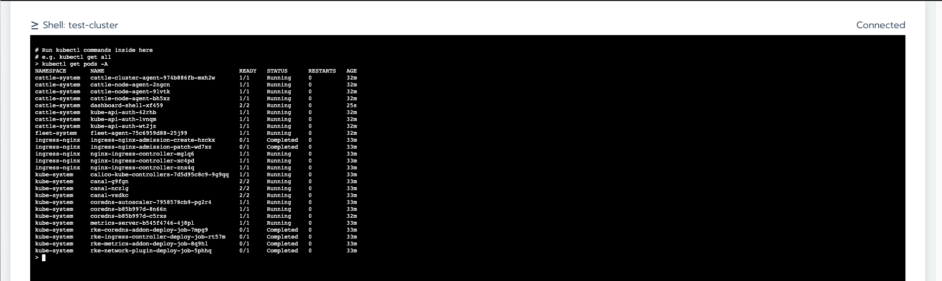 From here, you can run any command on the selected cluster. As shown, the kubectl get pods -A command has been run. This means, without switching contexts in your terminal, you can easily use kubectl commands on any of the Rancher-managed clusters.