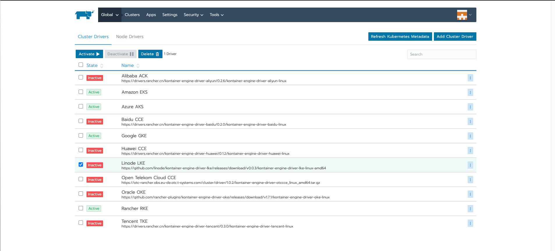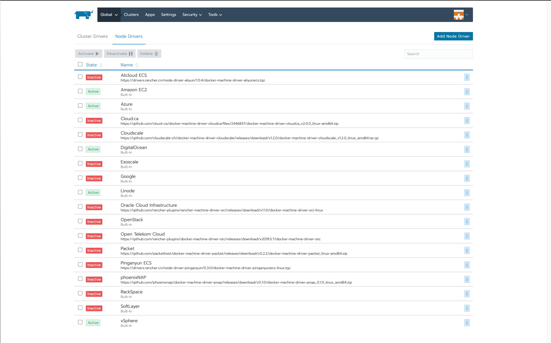 In both cases, you can activate, deactivate, or even add new drivers from Rancher’s graphical interface.