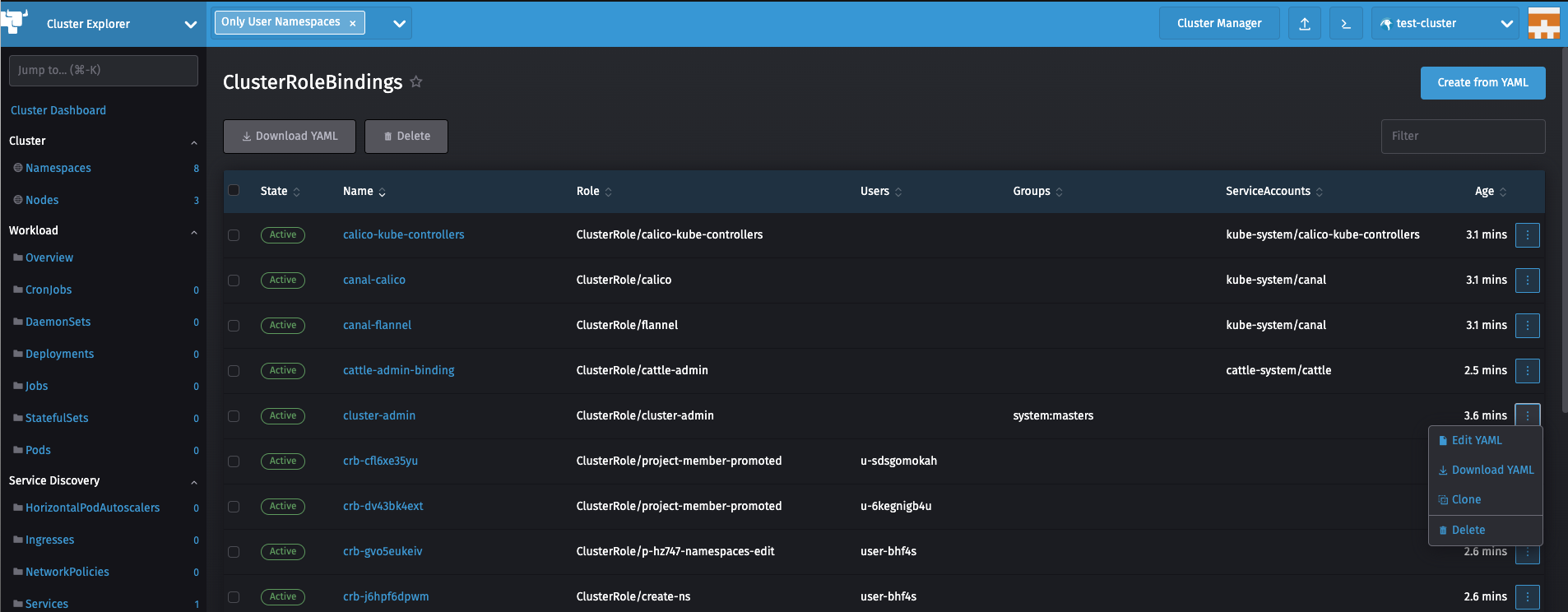 As briefly mentioned in the previous section, from the Rancher Cluster Explorer, you can manage Kubernetes’s role-based access control (RBAC):