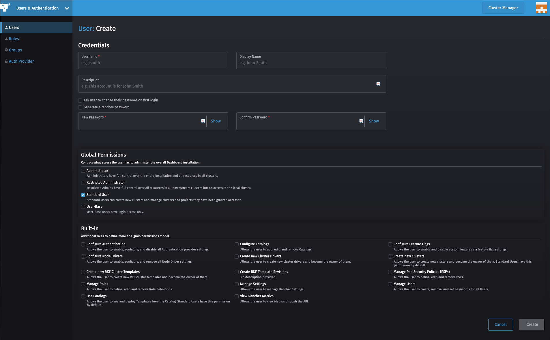 Rancher, however, does have built-in support for major authentication providers and also offers you absolute control over the permissions granted to each user: