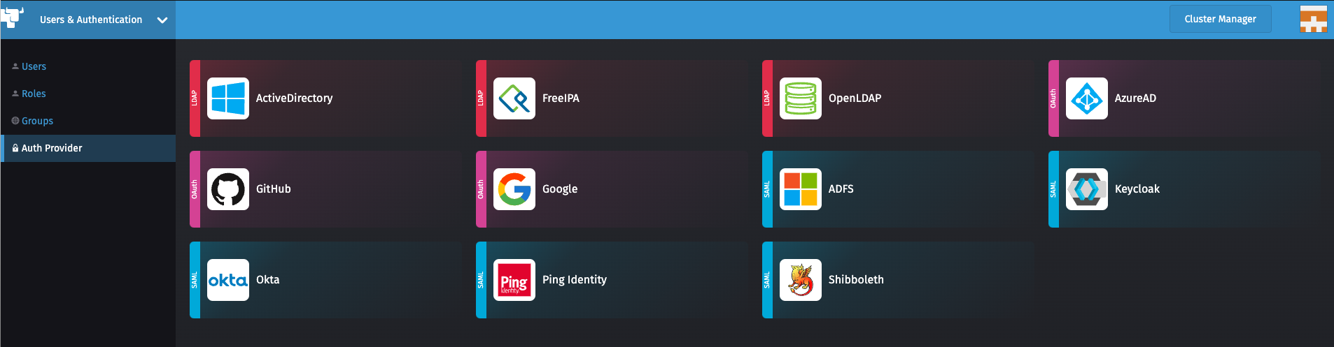 Rancher enforces security and convenience by facilitating authentication mechanisms, such as Active Directory (AD), Azure AD, GitHub, Google, Security Assertion Markup Language (SAML) support for Lightweight Directory Access Protocol (LDAP), and Okta.