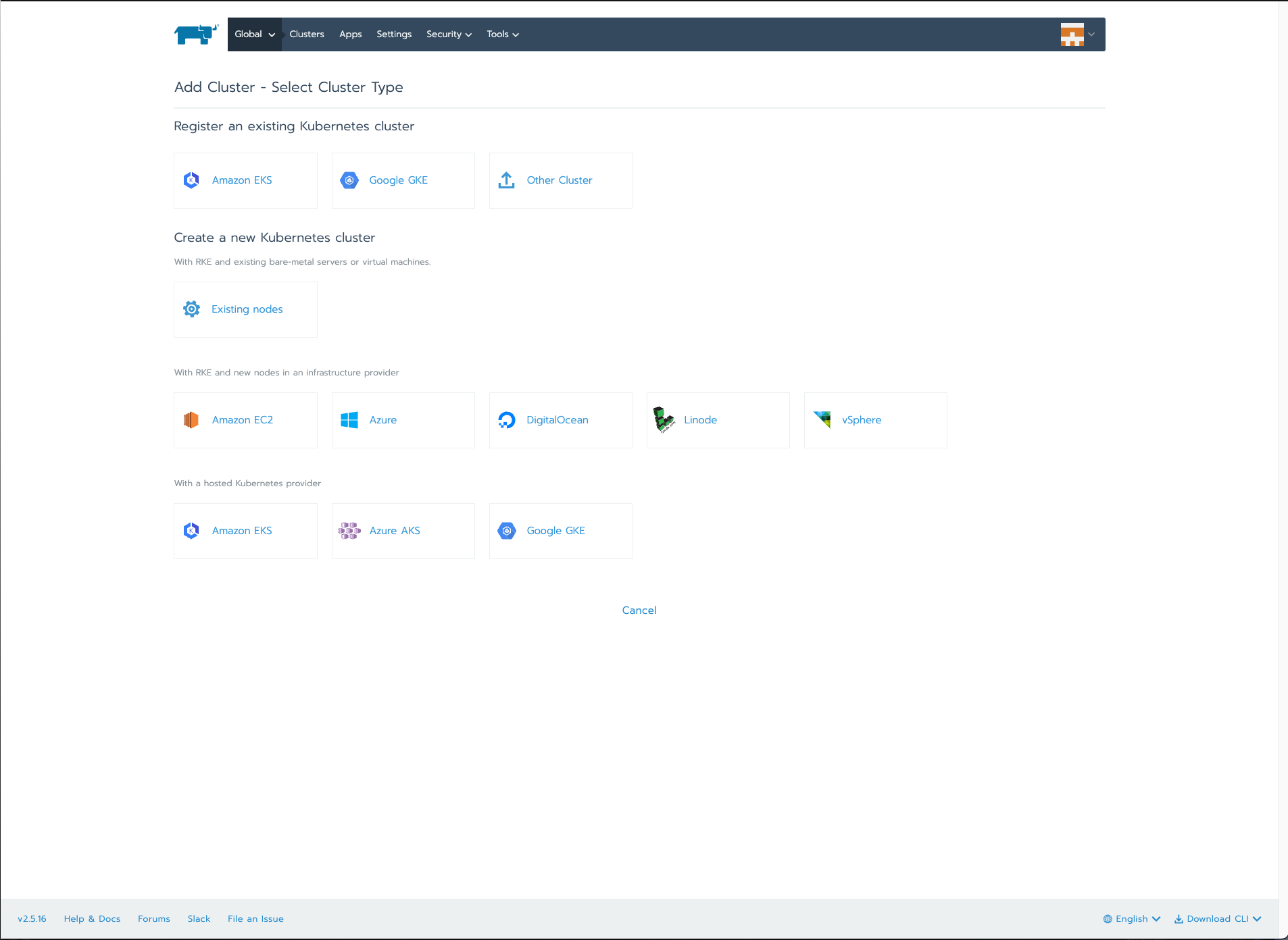Rancher allows your DevOps team to seamlessly deploy managed Kubernetes clusters on popular platforms, like Amazon Elastic Kubernetes Service (EKS), Azure Kubernetes Service (AKS), and Google Kubernetes Engine (GKE). It also has drivers that provide support to other vendors, like DigitalOcean Kubernetes (DOKS), Linode Kubernetes Engine (LKE), Alibaba Cloud Container Service for Kubernetes (ACK), Baidu Cloud Container Engine (CCE), Huawei CCE, Open Telekom Cloud CCE, Oracle Container Engine for Kubernetes (OKE), and Tencent Kubernetes Engine (TKE). With Rancher, development teams can easily create custom drivers, making it possible for Rancher to support virtually any existing Kubernetes platform.