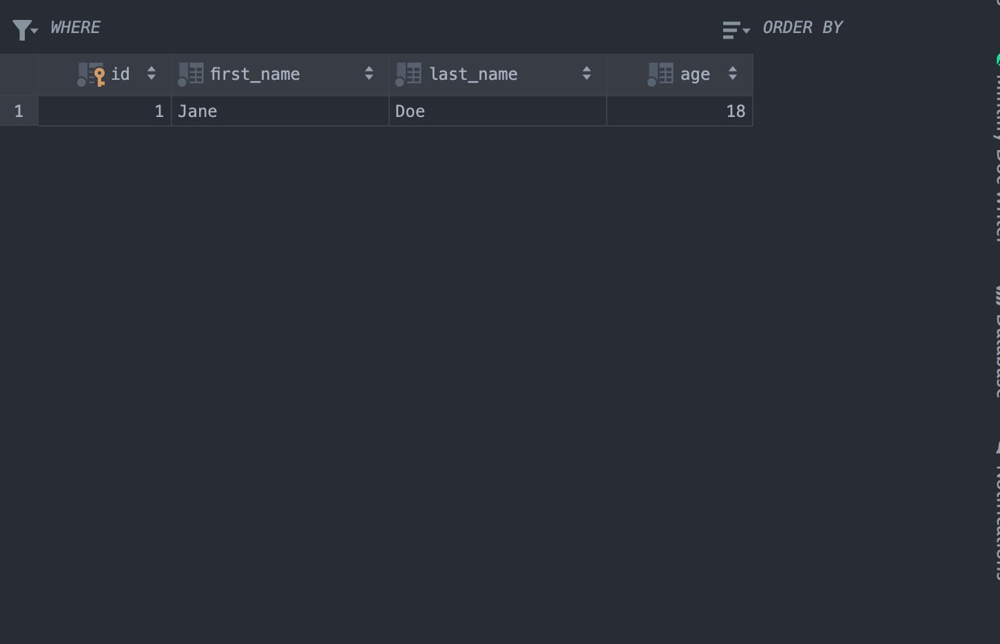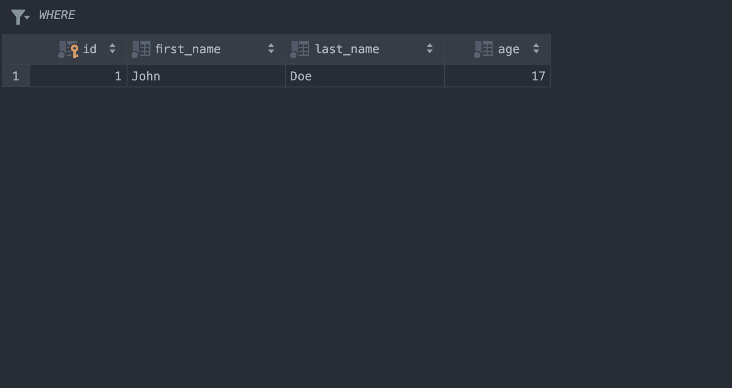 '{"first_name": "Jane", "last_name": "Doe", "age": 18}'Here’s the result of the update operation attempt for the row with the id equal to 1.