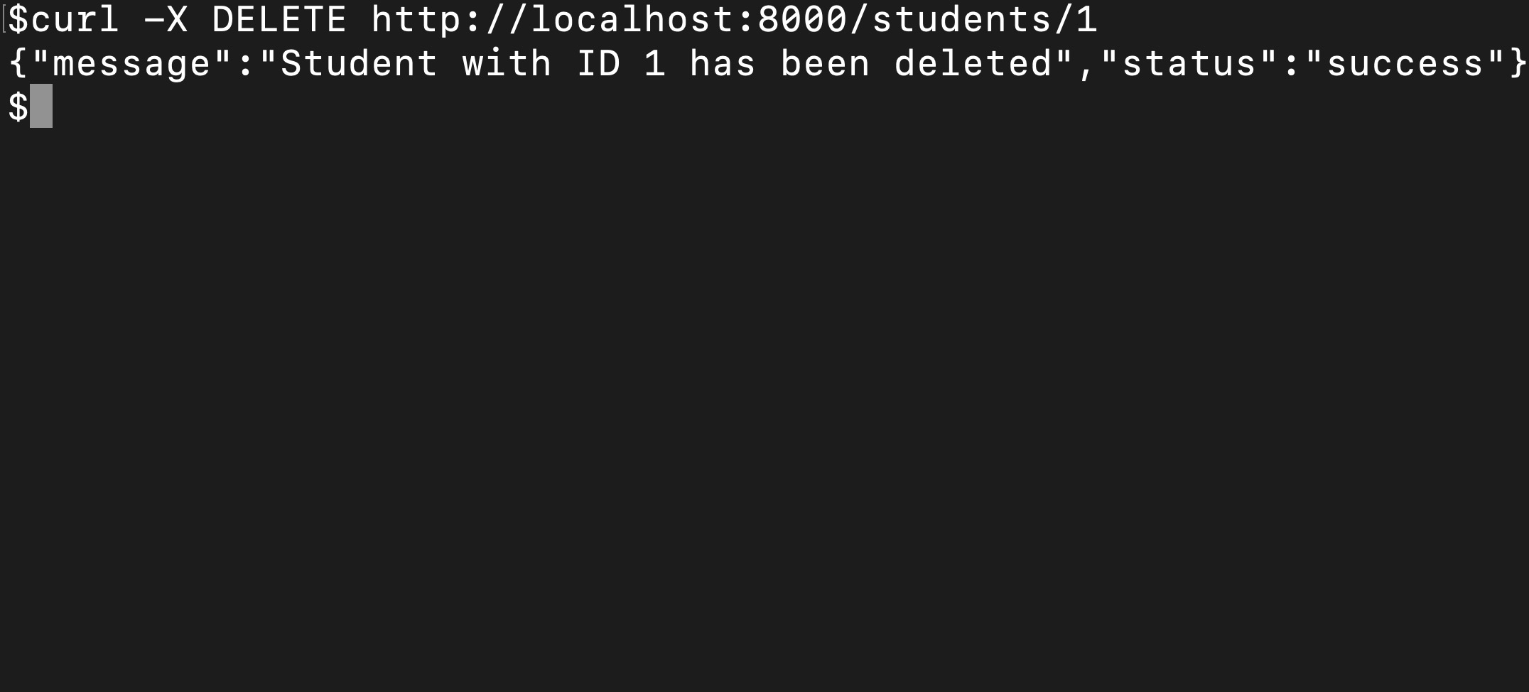curl -X DELETE http://localhost:8000/students/1Here’s the result of the delete operation attempt for the row with the id equal to 1: