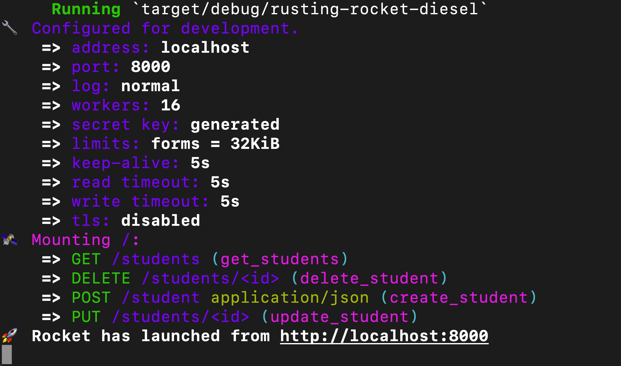 }On running your project with the cargo run command, the rocket should start a server on port 8000, and you can proceed to make API calls to your POST request endpoint.