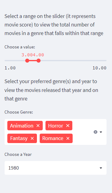 year_list, 0)st.sidebar() is the function to call a sidebar widget. Once this is specified, the sidebar is automatically created. Our sidebar will hold different widgets so we use it in the with statement. st.slider is the function that creates a slider widget. It takes in parameters like label, min_value, max_value, and a value. The min_value is the specified minimum value. The max_value is the specified maximum value. The value is the point where it is rendered. st.multiselect() is the function that creates a multiselect widget. From our tutorial, we created a multiselect widget that displays all unique genres from the ‘genre’ column. We pre-selected ‘Animation’, ‘Horror’, ‘Fantasy’ and ‘Romance’ genres. While interacting with this widget, users can select or deselect as many options as they wish. A selectbox is created by calling the st.selectbox() function. The selectbox represents a drop-down menu that allows only one option to be picked at a time. We linked the ‘year’ column to this widget, so we can only pick one year at a time.