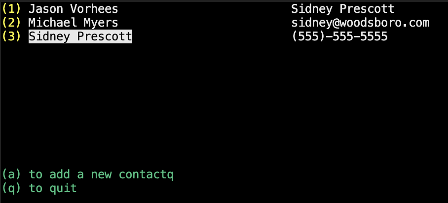 You may notice that pressing q still quits. Not great if your contact’s name is Quincy Quigley. Don’t worry, we’ll fix this a little bit later.