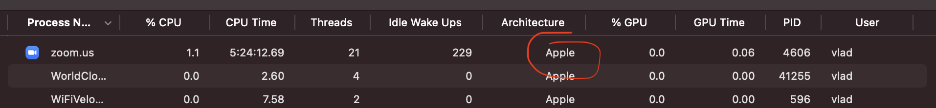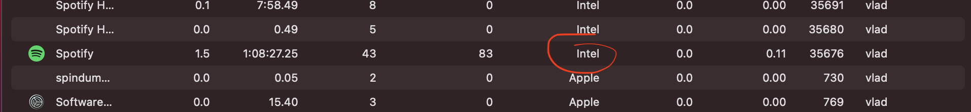 The easiest way to tell the difference is by opening Activity Monitor and looking at the Architecture column: if it says Apple, it’s ARM. If it says Intel, it’s X86_64. Here’s how I can tell that Zoom is an ARM process, while Spotify is an X86_64 process.