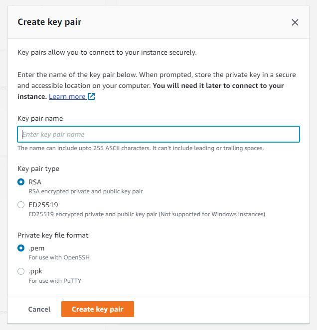 In order to log in and SSH into your box, you’ll need to ensure you have a key pair name. If you don’t have one, then create one, as shown in the following UI: