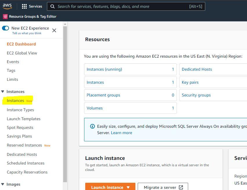 Open the Instances menu and click Instances, highlighted in yellow in the previous picture. This will launch your EC2 instance.