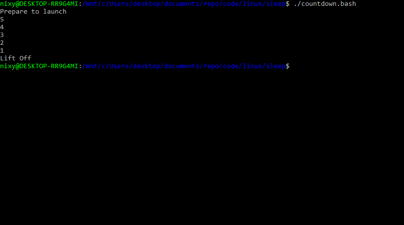 echo "Lift Off"Here’s what that looks like when running in the Linux command line: